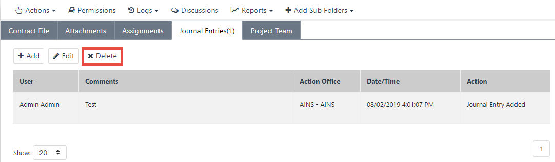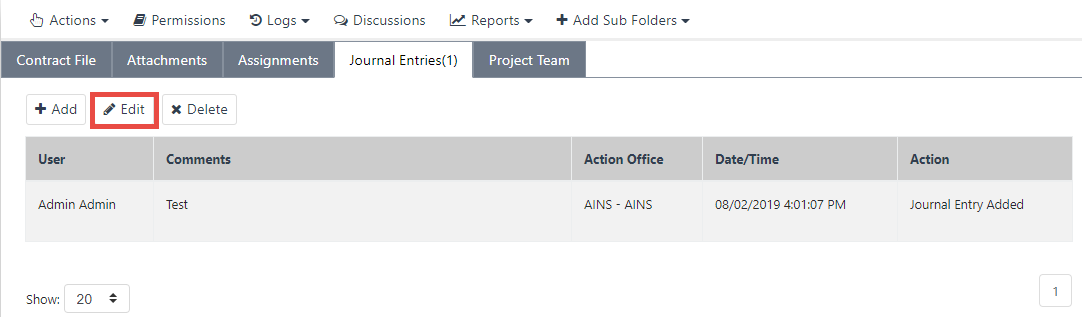 The Journal Entries tab is available in all case folders. The Journal Entries tab displays all current Journal Entry information, and allows users to edit or delete existing entries. Unlike other tabs, clicking an entry does not select or open the Journal Entry. Alternatively, depending upon the instance, some eCASE configurations may display the Journal Entries tab as Notes, Memorandum, etc.