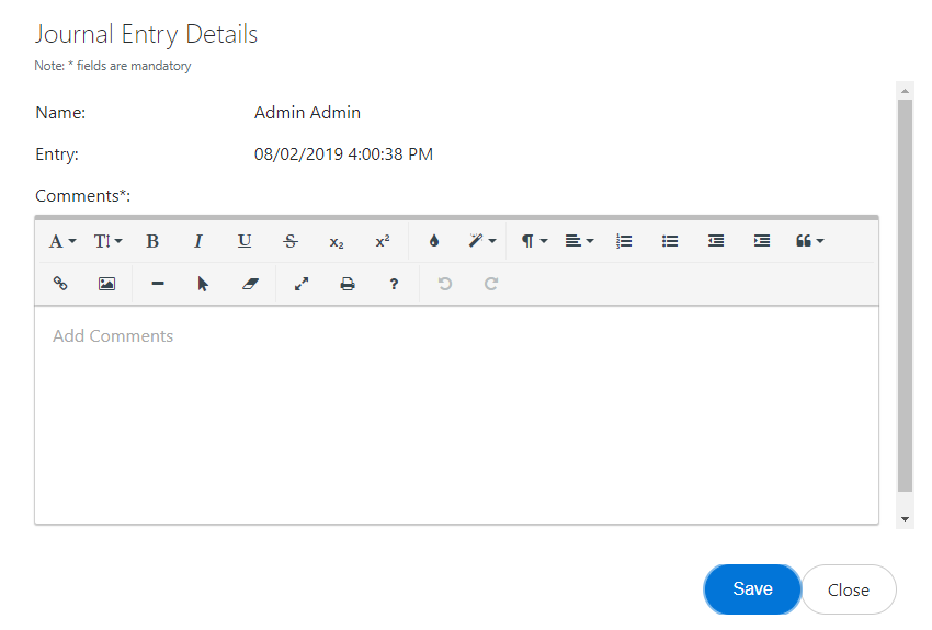 (!!) Note: The Journal Entry pop up window features a text editor. Users are not limited to submitting a plain text entry.