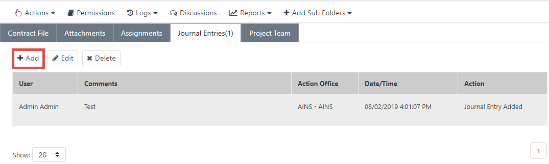 Within the Journal Entries tab, the page appears with any previously created Journal Entries displayed in the workspace. The folder ID is highlighted at the top of the screen. To create a new Journal Entry: