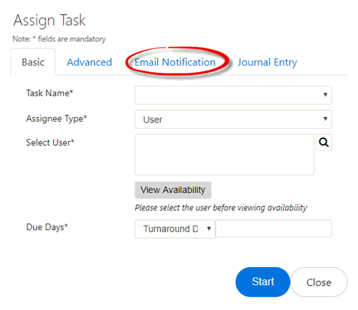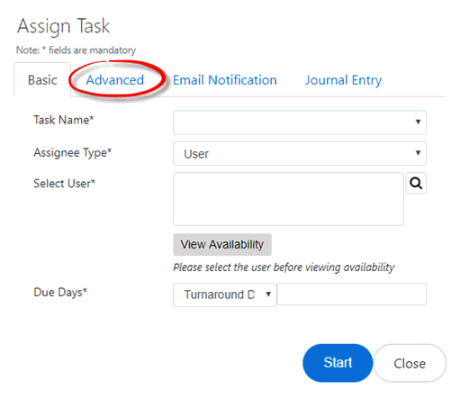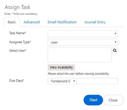 If the fields within the Basic tab are complete, click Start to assign the task to a user. If additional work is required on the Basic tab, navigate back to the tab and enter any remaining required information.
