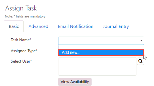 If no Task Names have been preconfigured, select the Add New option from the drop down list.