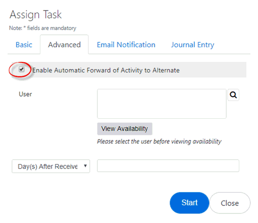 Click the Enable Automatic Forward of Activity to Alternate checkbox to expand the Advanced options, which allow authorized users to set an alternate for the task assigned within the Basic tab.