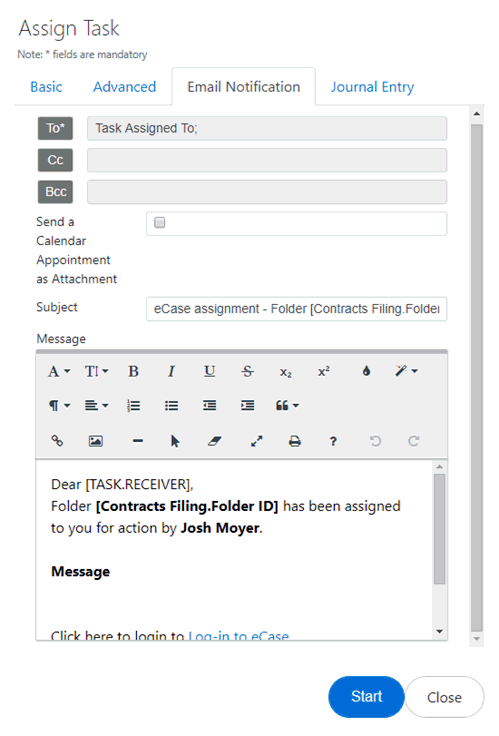 eCASE offers email notification options to authorized users assigning tasks. To utilize the Assign Task Email Notification options: