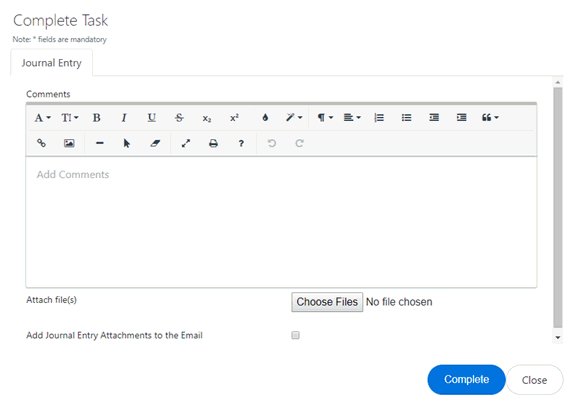 If required, users can add attachments to support the Complete Task Journal Entry by clicking Choose Files.