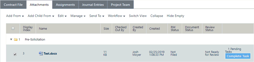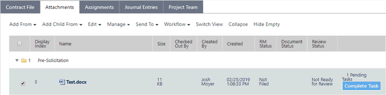 Within the Attachments Workspace, select the assigned attachments. These items display the Complete Task button in the right column, as well as a notification indicating the number of pending tasks assigned to that user for that attachment.