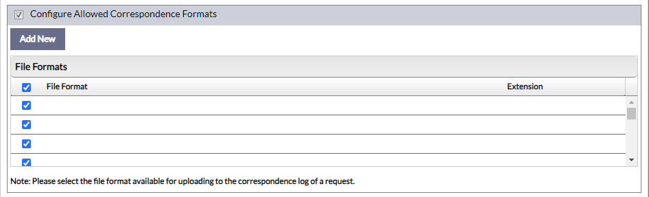 From the Correspondence Configuration, click the Configure Allowed Correspondence Formats checkbox, then click Add New. The Configure Allowed Correspondence Formats section displays as shown below.