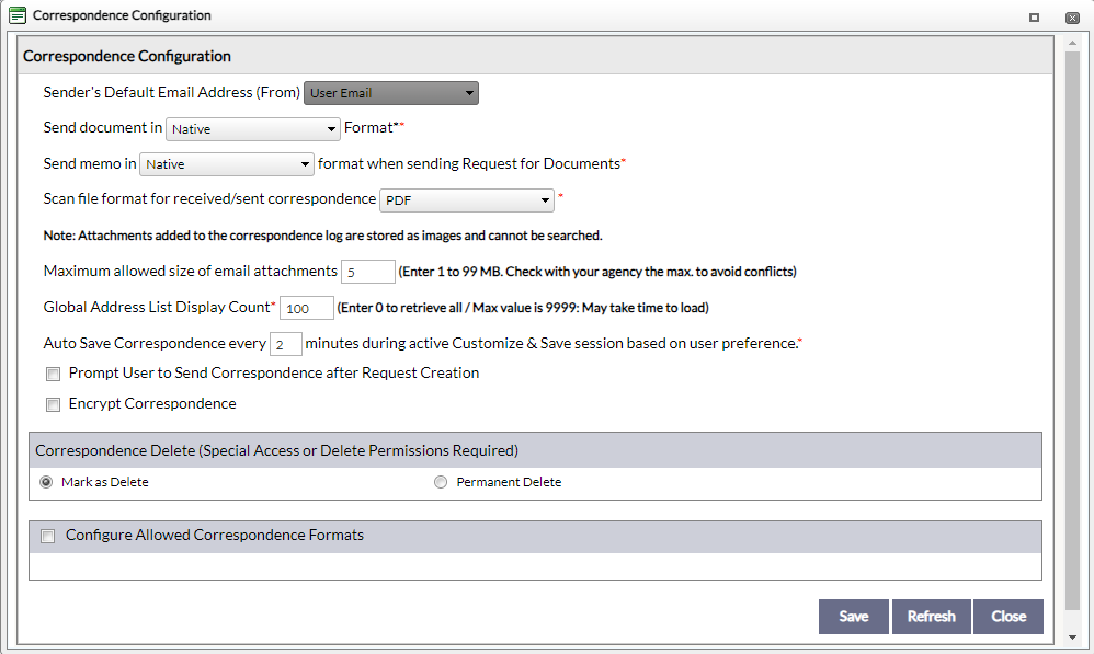 The Correspondence Configuration screen allows you to configure the file formats to be used while uploading correspondence attachments, and options for sending, receiving and encrypting correspondence.